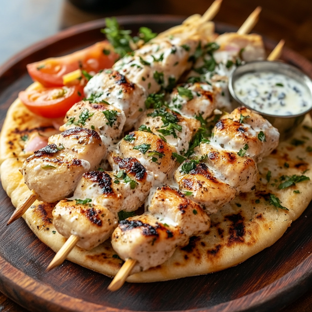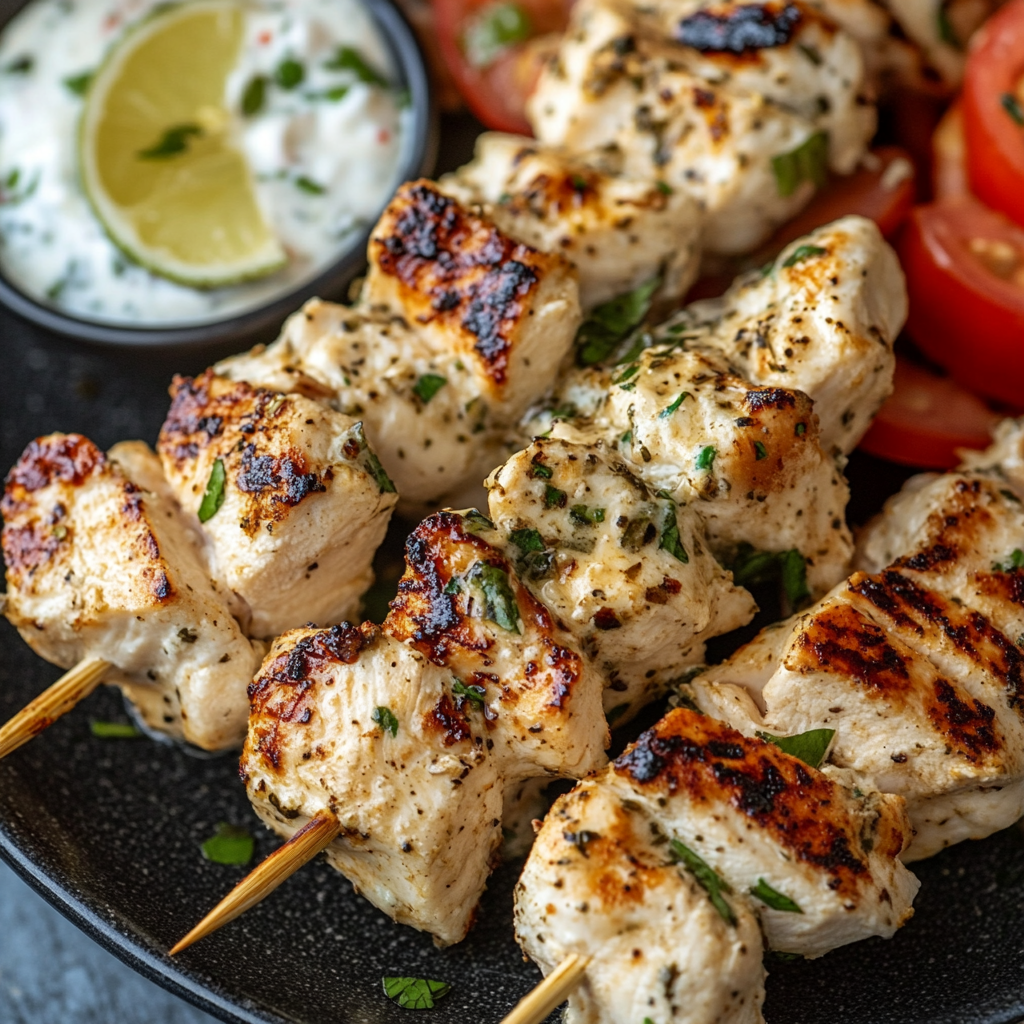 Serve Chicken Souvlaki with warm pita bread, fresh Greek salad, and a side of tzatziki sauce for an authentic experience.
