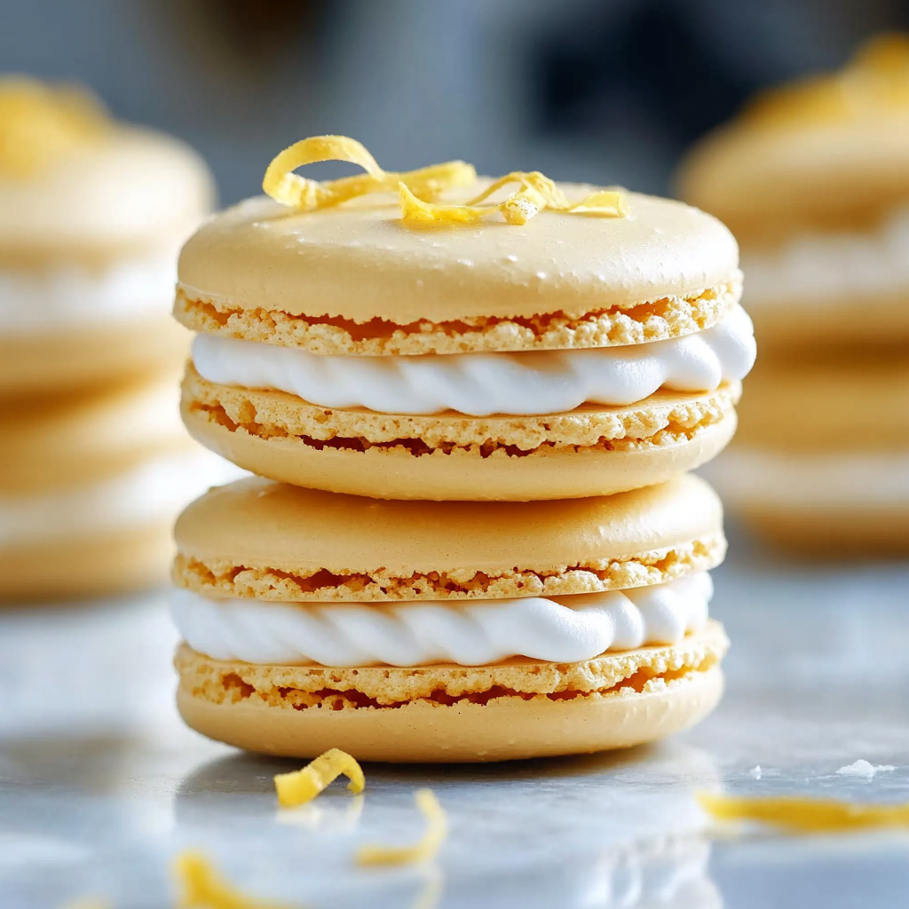 - Once cooled, match macaron shells, pipe in lemon filling, and top with another shell.