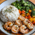 Garlic Butter Shrimp with Steamed Rice & Mixed Vegetables is a delightful dish that’s both quick and nutritious, perfect for any meal. This recipe features succulent shrimp sautéed in a rich garlic butter sauce, served over fluffy jasmine rice and vibrant mixed vegetables like broccoli, cauliflower, and carrots. With its eye-catching colors and mouthwatering flavors, this dish is sure to impress family and friends alike. Not only is it easy to prepare in just 25 minutes, but it’s also versatile enough for lunch or dinner, making it a fantastic addition to your weeknight menu.