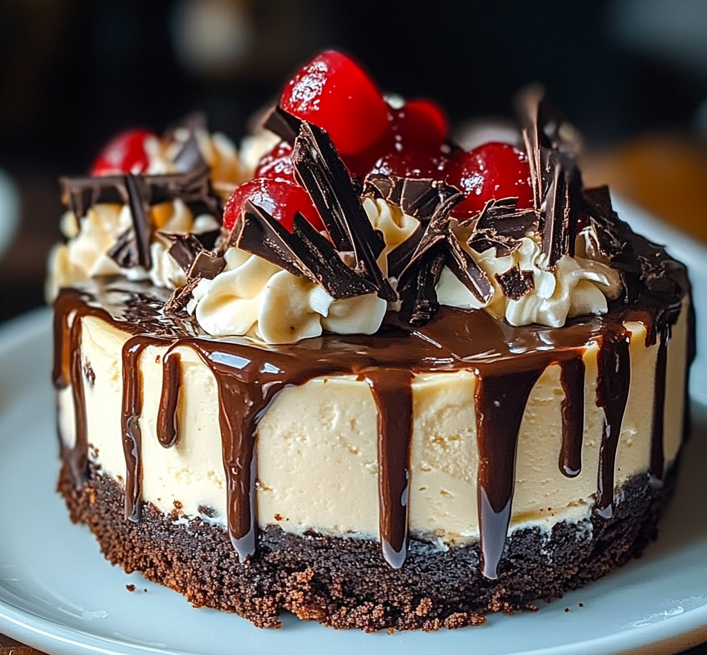 - Assemble: Remove cheesecake from pan, drizzle with hot fudge, top with whipped cream, chocolate shavings, and cherries.