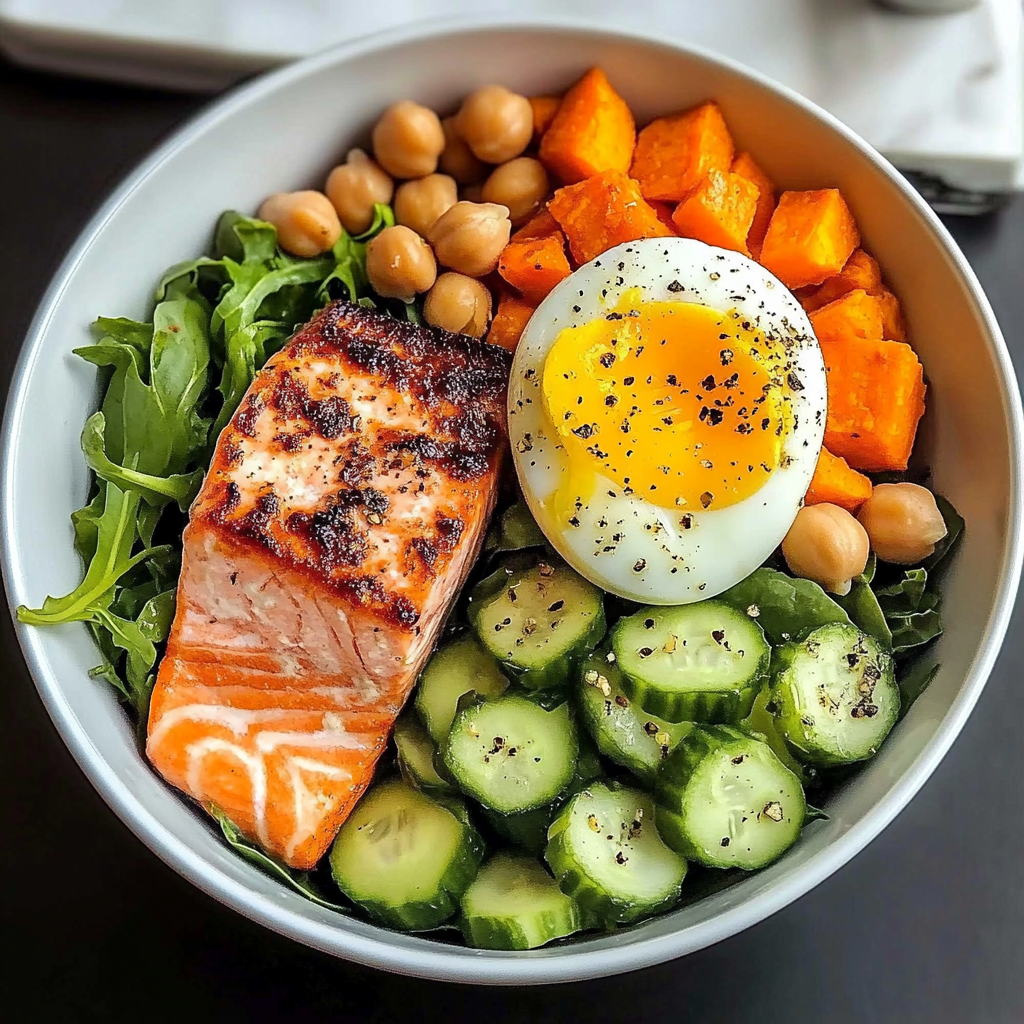 Start with a base of mixed greens in a bowl. Top it with pieces of salmon, halved soft-boiled egg, roasted sweet potato cubes, diced avocado, sliced cucumber, halved cherry tomatoes, thinly sliced red onion, chickpeas, and crumbled feta cheese. Season to taste and drizzle with your choice of dressing if desired.