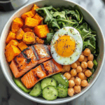 Start with a base of mixed greens in a bowl. Top it with pieces of salmon, halved soft-boiled egg, roasted sweet potato cubes, diced avocado, sliced cucumber, halved cherry tomatoes, thinly sliced red onion, chickpeas, and crumbled feta cheese. Season to taste and drizzle with your choice of dressing if desired.