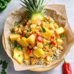 Chopped chicken is cooked with a sweet and tangy pineapple teriyaki sauce and served in vibrant pineapple boats. This Pineapple Chicken With Rice Recipe is a delightful dish perfect for weeknight dinners or special occasions. Its unique presentation and flavor make it a standout choice for family meals and gatherings, appealing to both kids and adults alike.