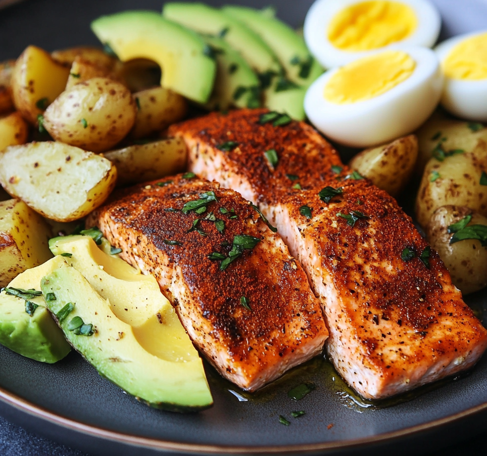 Spiced Salmon with Garlic Herb Potatoes, Avocado & Soft-Boiled Eggs