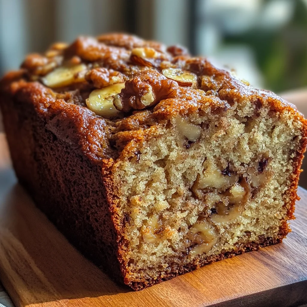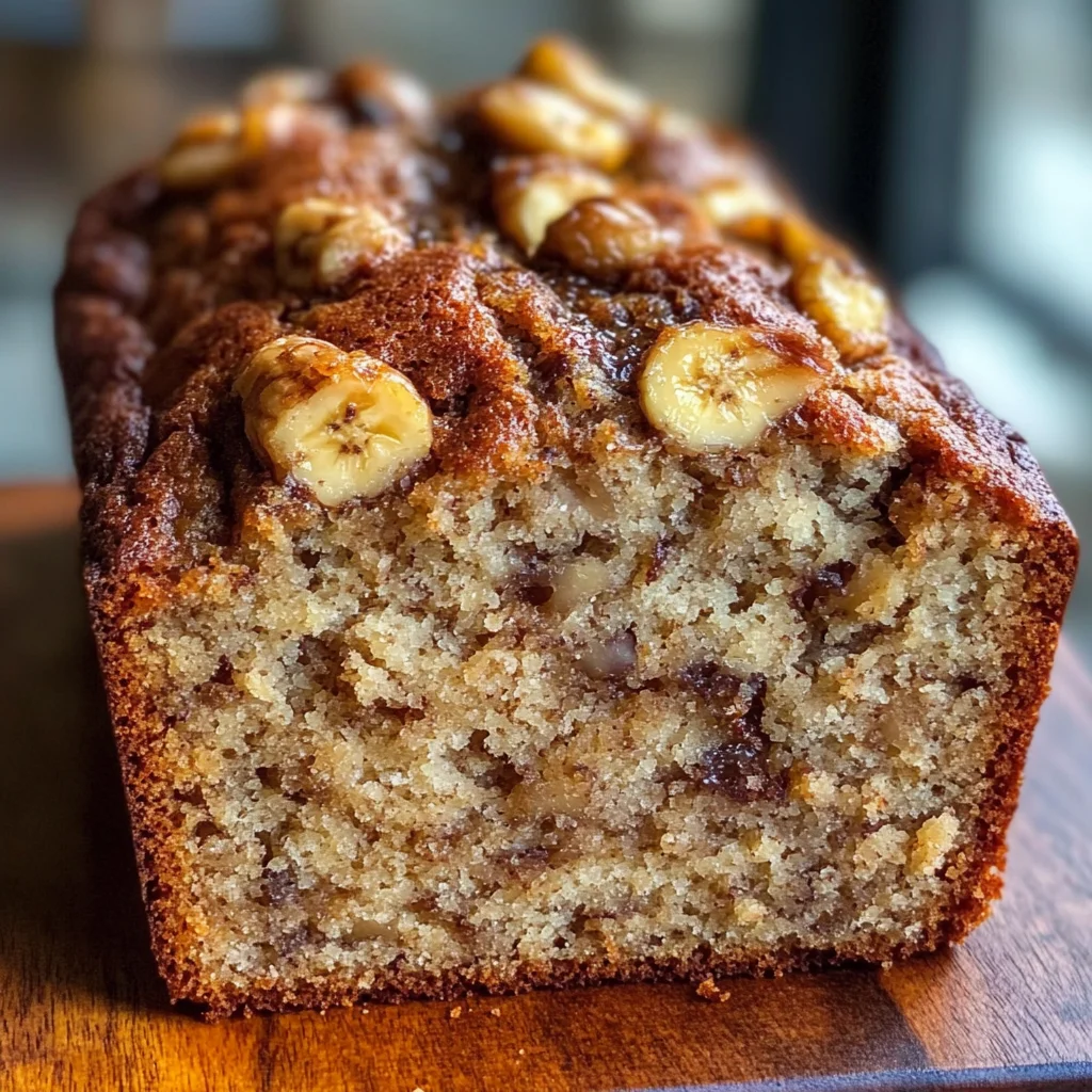 Golden banana bread with ripe bananas, buttery flavor, and a hint of spice—delicious warm or cool.